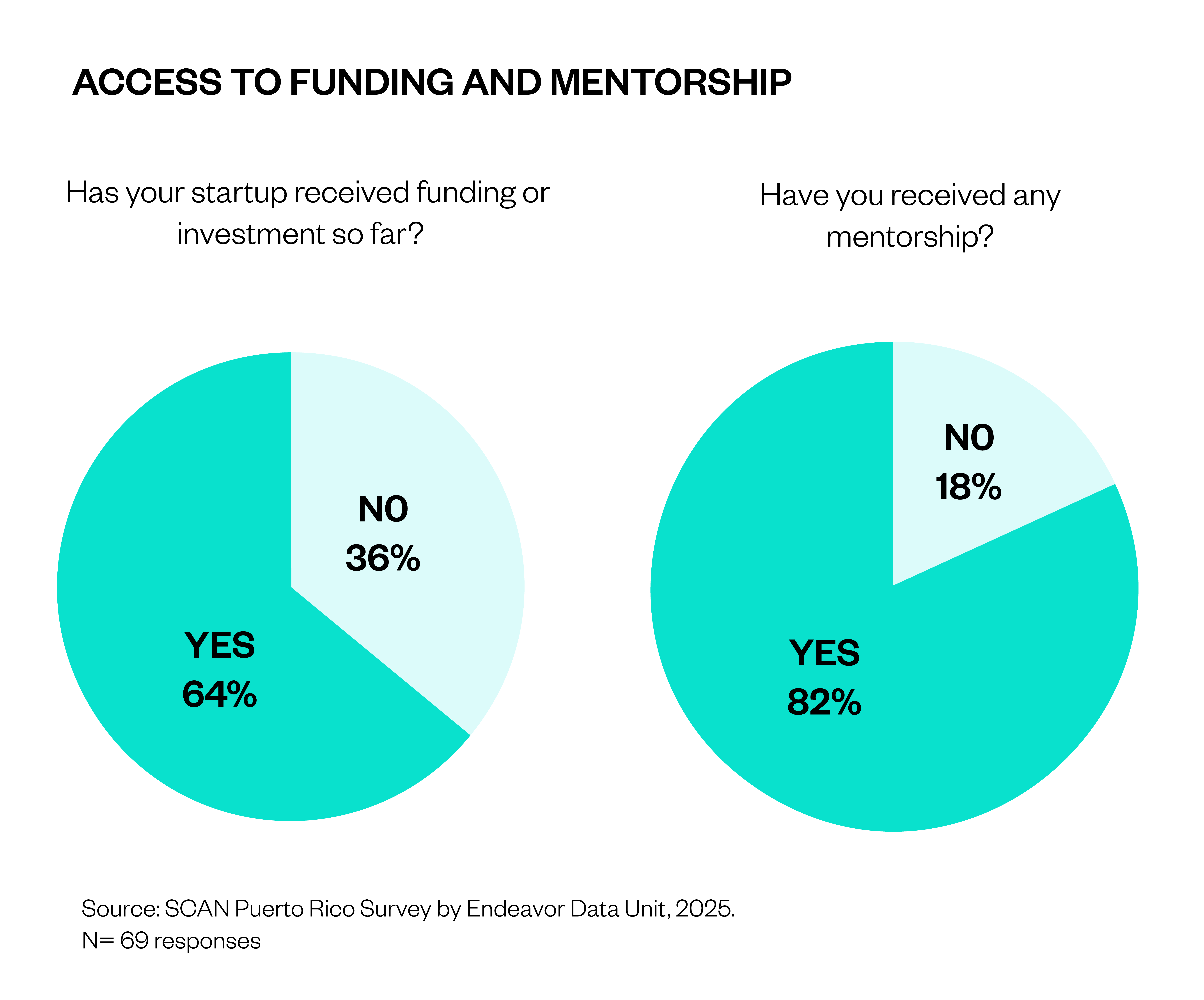 Despite a lack of depth in the capital market, most startup founders in Puerto Rico have accessed external support; 64% have received some form of funding and 82% have benefited from mentorship. These figures suggest a supportive environment where startups are leveraging external resources to grow. Yet a closer look reveals a nuanced pattern: only 60% of founders who have received financing were born in Puerto Rico, pointing to a strong presence of external or non-native talent among those attracting capital. This may reflect greater investor confidence in founders with broader networks or previous experience outside the island.