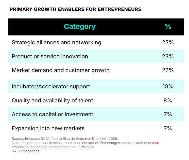 In a funding-constrained environment—where only 7% of Puerto Rican entrepreneurs identified access to capital and investment as a key growth enabler—startups have leaned on more accessible drivers of expansion. Strategic alliances and product or service innovation emerged as the top enablers, each cited by 23% of founders, underscoring the importance of strong networks and differentiated value propositions. Innovation proves especially critical in financial services, where 26% of entrepreneurs credited it as their primary growth engine.