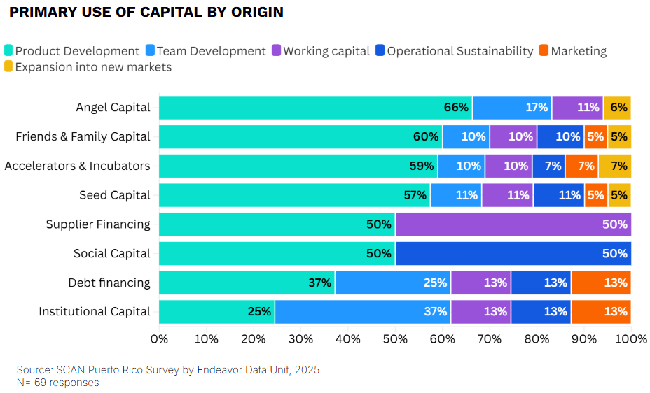 Investments in Puerto Rican startups are primarily directed towards product development, reflecting a strong focus on building and validating core offerings. This focus is particularly pronounced among early-stage funding sources: 66% of angel investments, 60% of friends and family contributions, and 59% of accelerator and incubator support go toward product-related activities. These sources play a pivotal role during a startup’s formative phase, where developing tangible prototypes or MVPs is essential for gaining early traction.